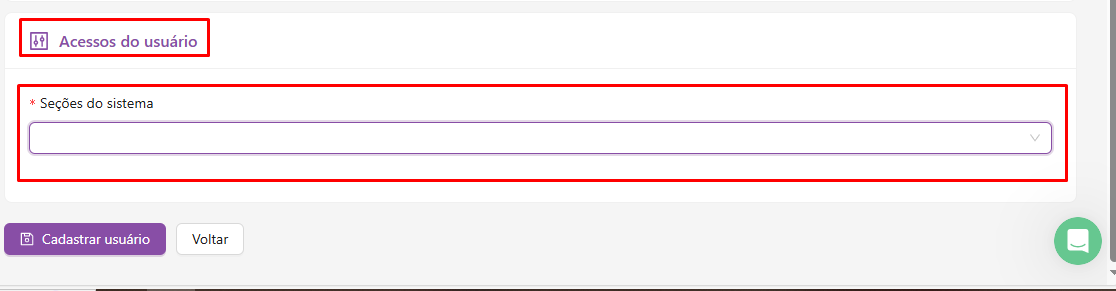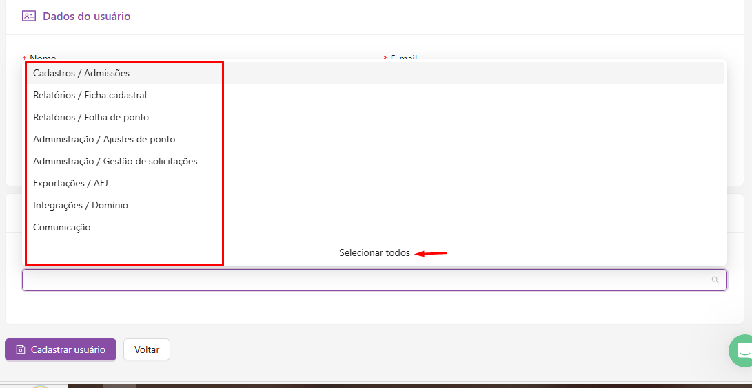 Depois de preencher os dados do usuário temos o ACESSOS DO USUÁRIO onde o criador irá configurar a liberação de acessos que o novo usuário cadastrado terá, podendo selecionar todos ou apenas alguns: