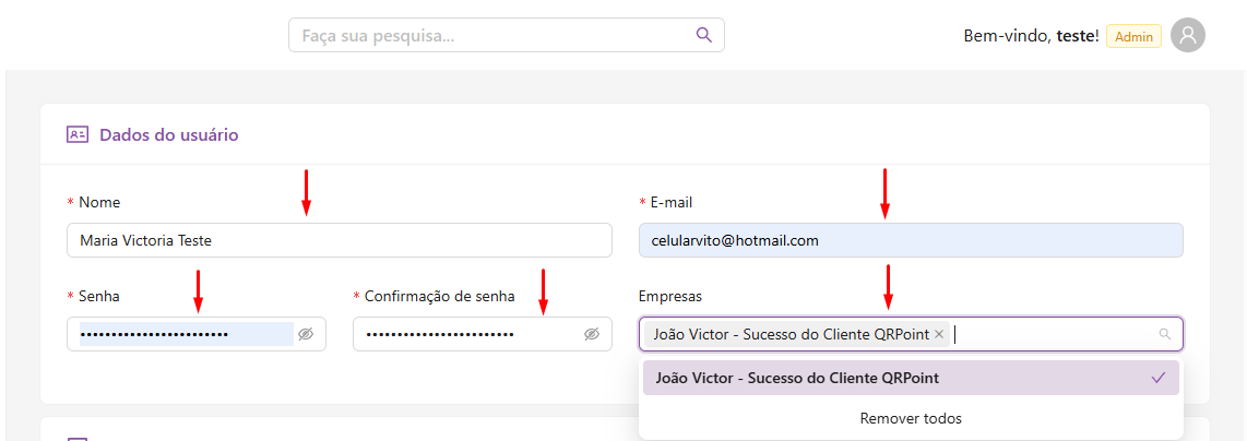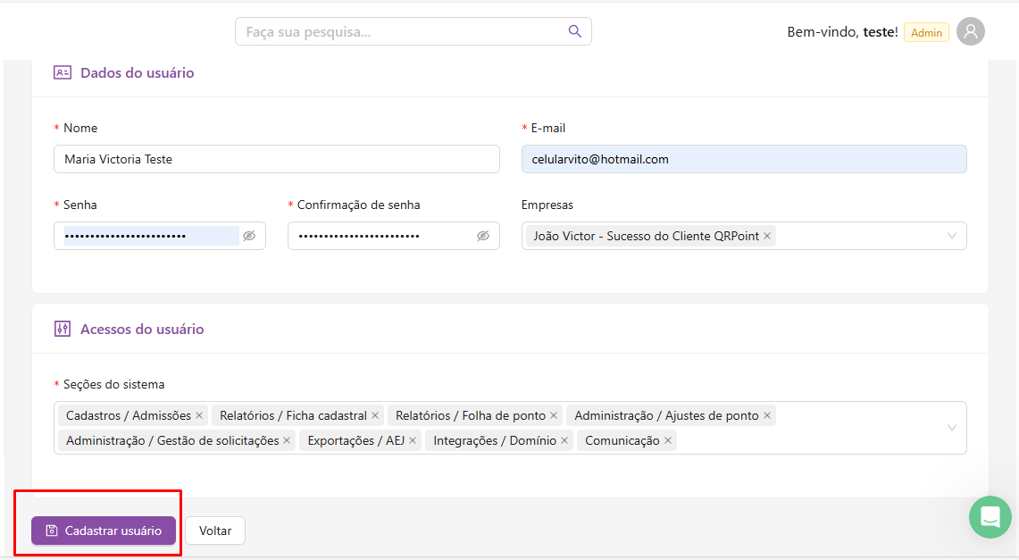 Após completar todas as informações do novo usuário é só salvar em CADASTRAR USUÁRIO e o acesso já estará liberado.