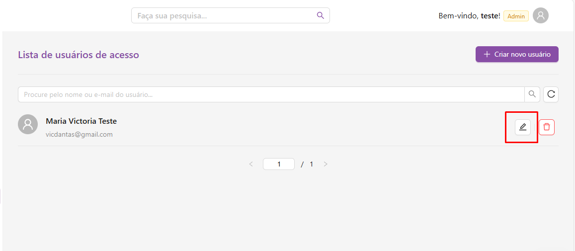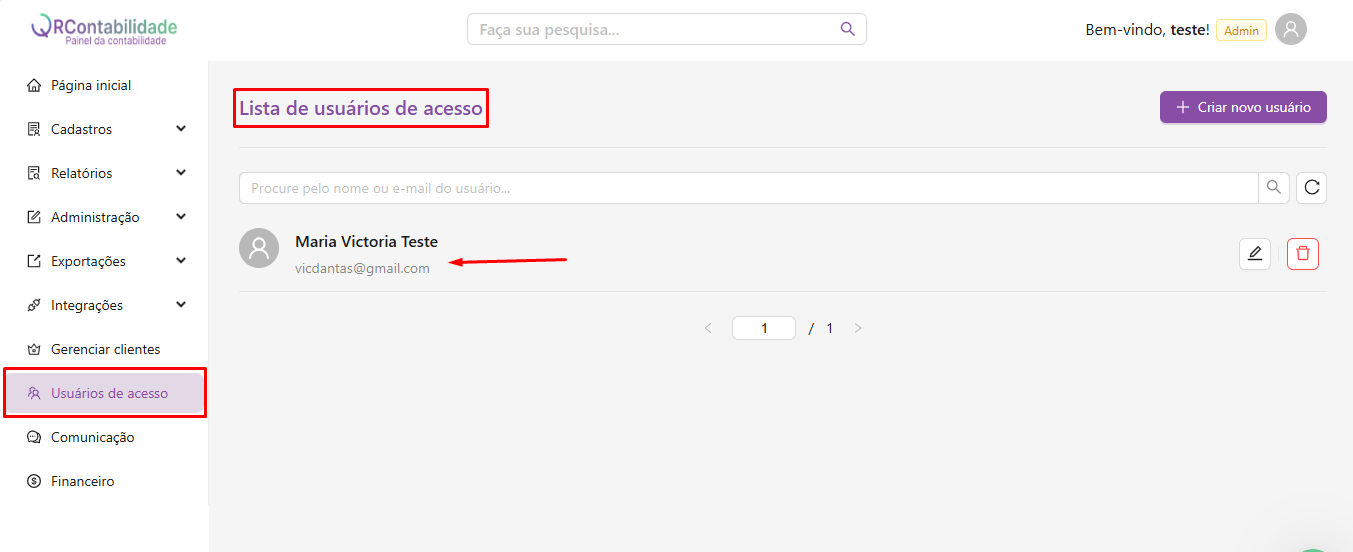Você conseguirá visualizar o cadastro que acabou de criar na tela de USUÁRIOS DE ACESSO > LISTA DE USUÁRIOS DE ACESSO >
