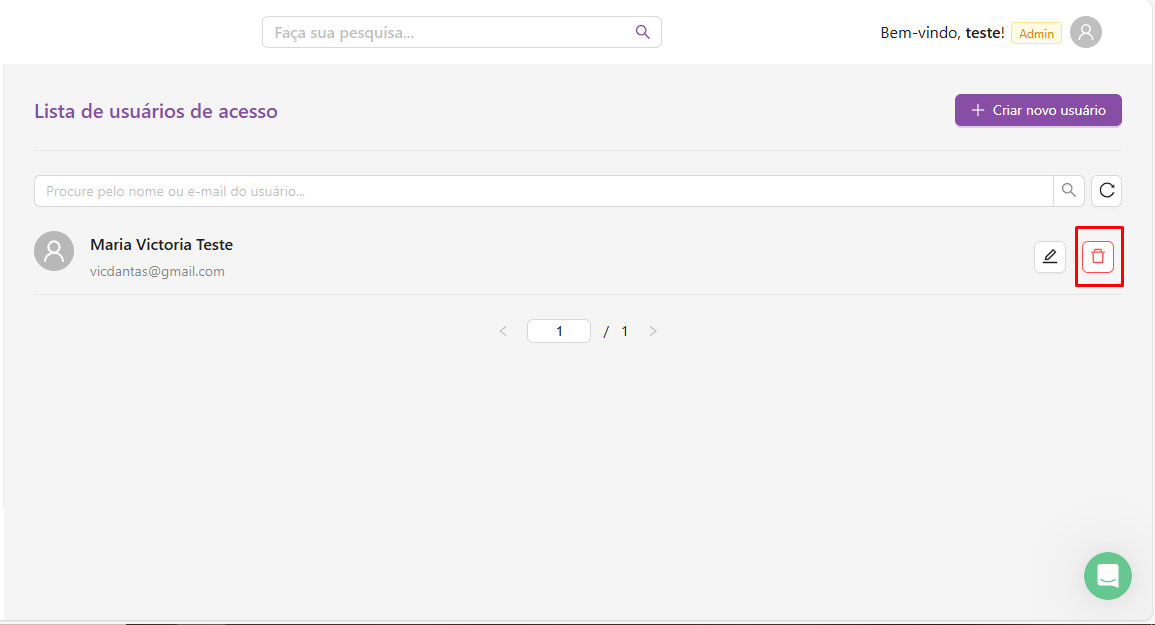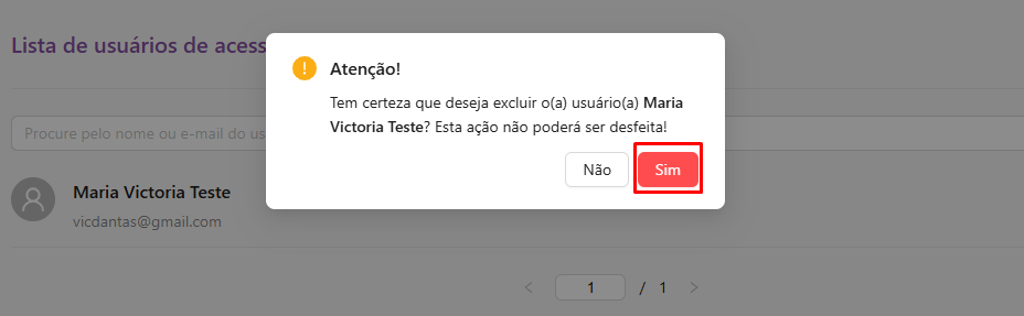 Se desejar excluir o cadastro do usuário de acesso é só clicar na lixeira > e selecionar "SIM".